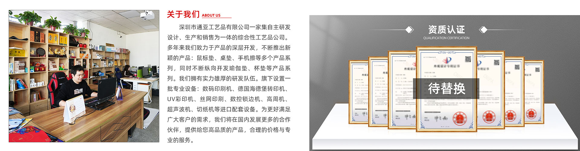深圳市通亞工藝品有限公司專業(yè)從事廣告鼠標(biāo)墊、禮品鼠標(biāo)墊、電競游戲桌墊、異形可愛卡通鼠標(biāo)墊、超大動漫桌墊、橡膠佳積布鼠標(biāo)墊、皮革桌墊、橡膠+皮革寫字墊、軟透明PVC日歷墊,發(fā)泡PVC鼠標(biāo)墊、3D立體吸水地墊、硅膠護(hù)腕墊、發(fā)光鼠標(biāo)墊、亞麻布發(fā)熱墊,無線充鼠標(biāo)墊、光伏玻璃鼠標(biāo)墊,生產(chǎn)與研發(fā)與一體的源頭工廠,公司成立至今得到了眾多客戶的認(rèn)可與依賴,也是深圳優(yōu)秀鼠標(biāo)墊供應(yīng)商之一,公司擁有一批先進(jìn)的鼠標(biāo)墊制作設(shè)備,體系完善、工藝精湛,追求完美、服務(wù)至上、質(zhì)量第一、誠信經(jīng)營是我們的宗旨!通亞人期待與您合作共贏!
