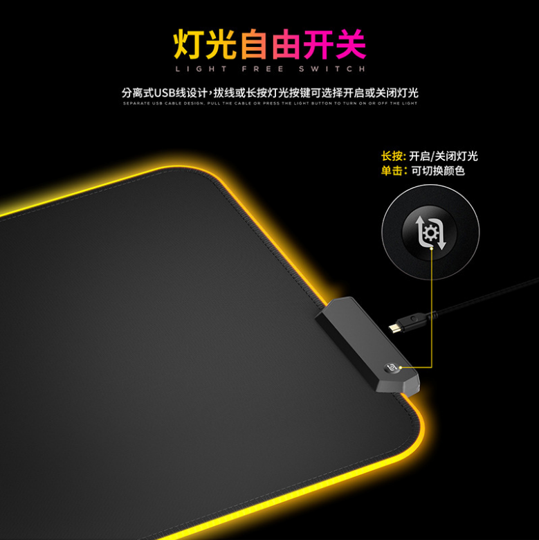 炫彩RGB游戲鼠標墊,織物面料編織,表面細膩、平整、操作穩(wěn)定,帶燈光切換按鍵,輕輕一按,燈光可自由切換,加厚橡膠底部,穩(wěn)固防滑